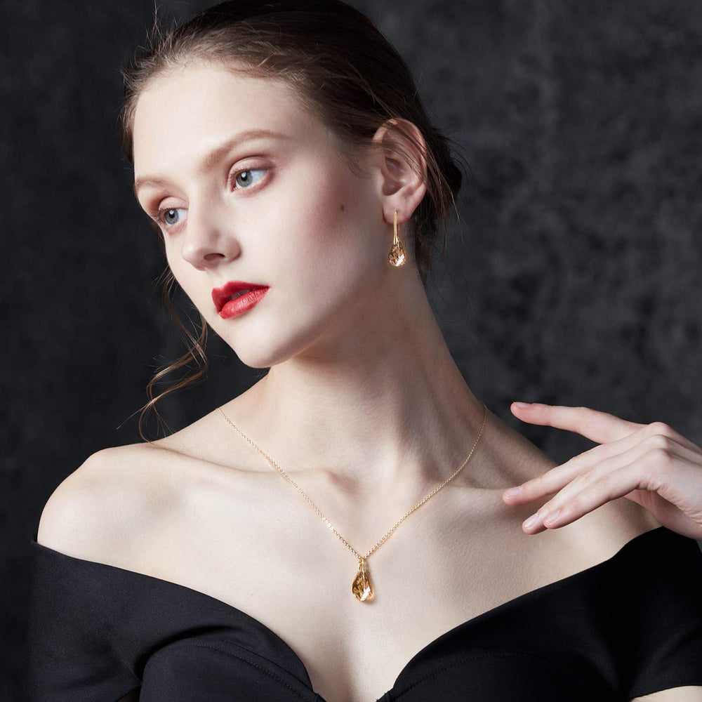 A gold pear-shaped stunning and shining crystals from Swarovski and the inspiration is from constant dropping wears the stone. this "keep funking going jewelry” symbolized the strong spirit that never gives up.