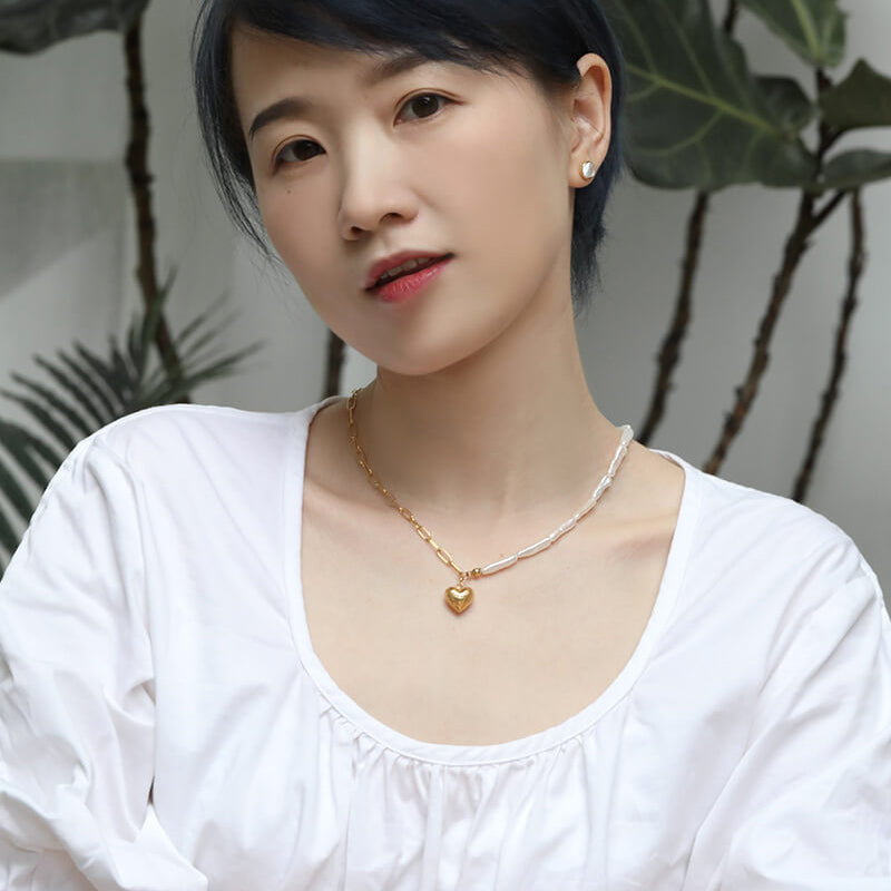 Selecting about 4 cm long nice luster natural baroque pearls pairing with a retro thick chain, this chain of the necklace is asymmetrical, very unique and chic, it features a large heart pendant, makes the necklace more cute and sassy.